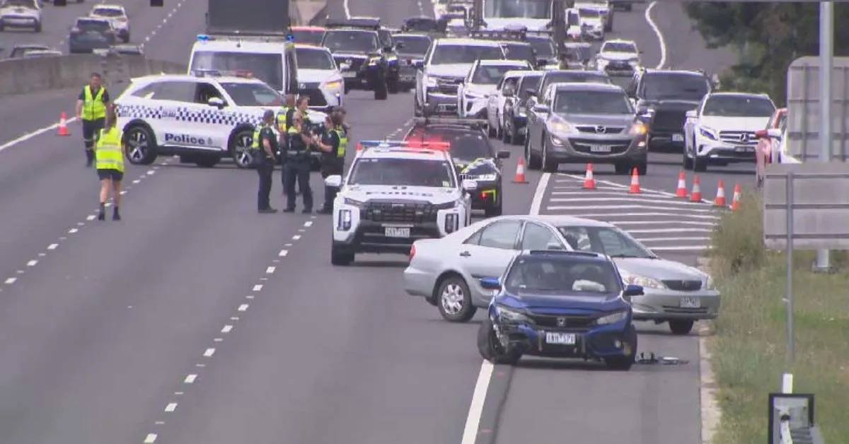 The chaos began about 2.30pm yesterday when two cars lost control after weaving through traffic on the Monash Freeway in Narre Warren in Melbourne’s south-east.