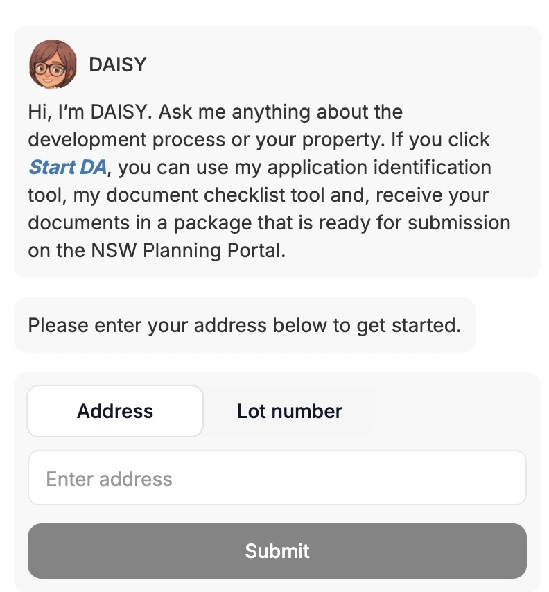 DAISY is aimed at helping with residential deveploment questions around applicable property planning rules, the type of application and documentation for it needed, and how to prepare such submissions ot the NSW Planning Portal.