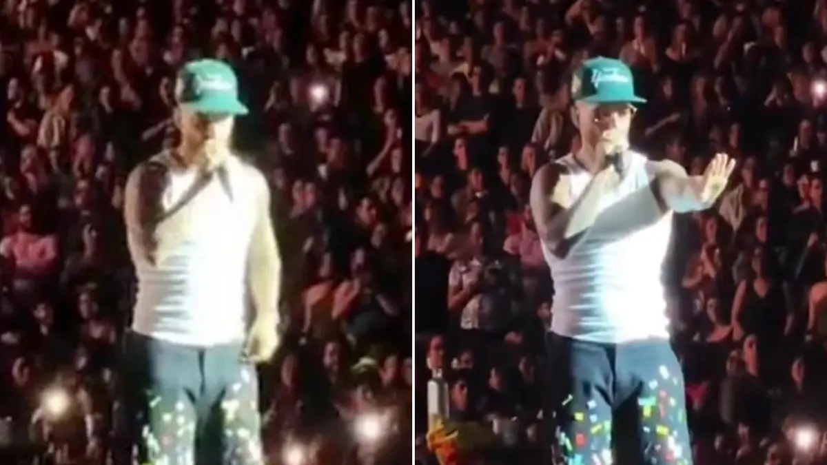 The father-of-one paused his performance and started speaking in Spanish to a woman — presumed to be the baby’s mother — in the crowd as the stadium fell quiet.