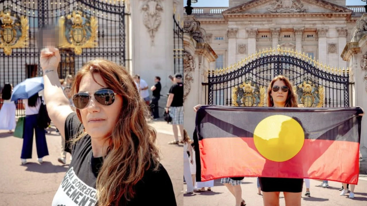The 51-year-old former Greens Senator posted several images to social media on Friday showing her standing outside the gates of the royal residence, holding the Aboriginal flag and raising her middle finger.
