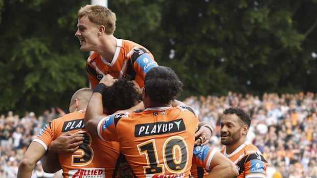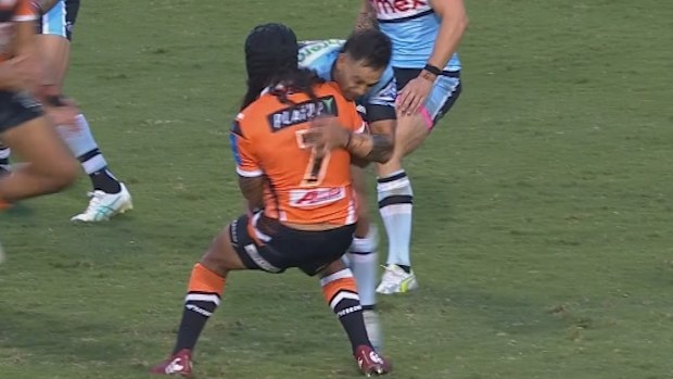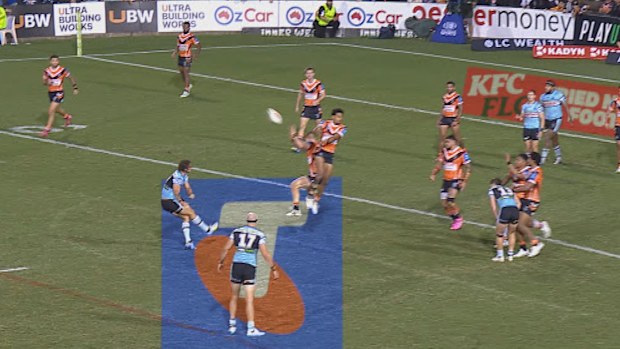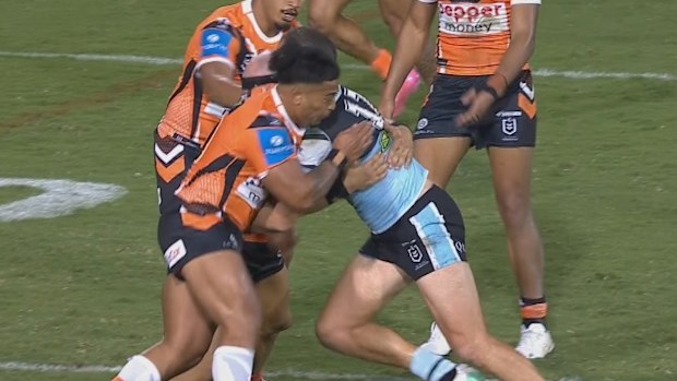 Cronulla would then be penalised for a high tackle, allowing the Tigers to get into field-goal range, but Adam Doueihi’s shot was sprayed wide of the posts.