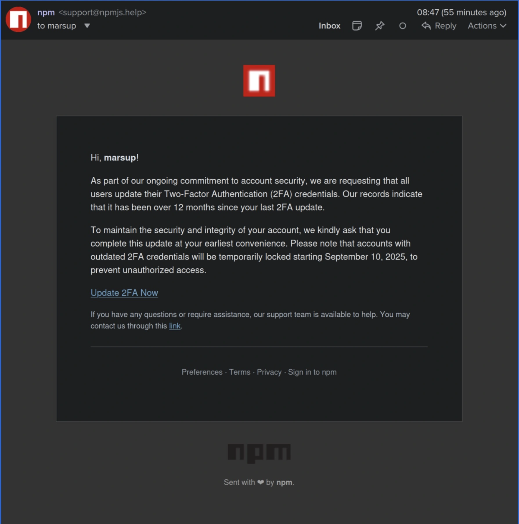 Developers reported on GitHub that they had been receiving very legitimate looking phishing emails from “support@npmjs.help” asking them to update their two-factor authentication (2FA) credentials.