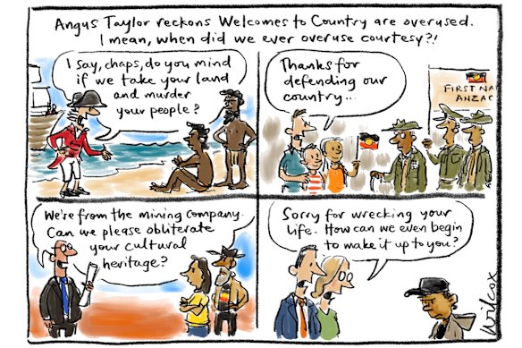 Angus Taylor is trying to appeal to the orange people, while not being caught out saying Welcome to Country should be scrapped. Sitting on the fence never works.