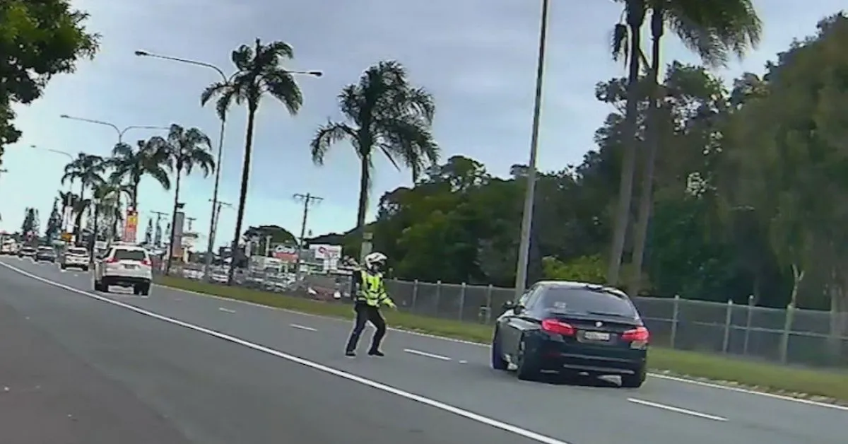 When the BMW driven by the P-plater swerved around the officer instead of stopping on Nicklin Way, he threw the radar gun at the car’s window.