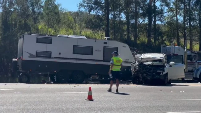 A Nissan SUV and a Toyota Landcruiser, which had been towing a caravan, collided into each other before the SUV hit a prime mover truck.
